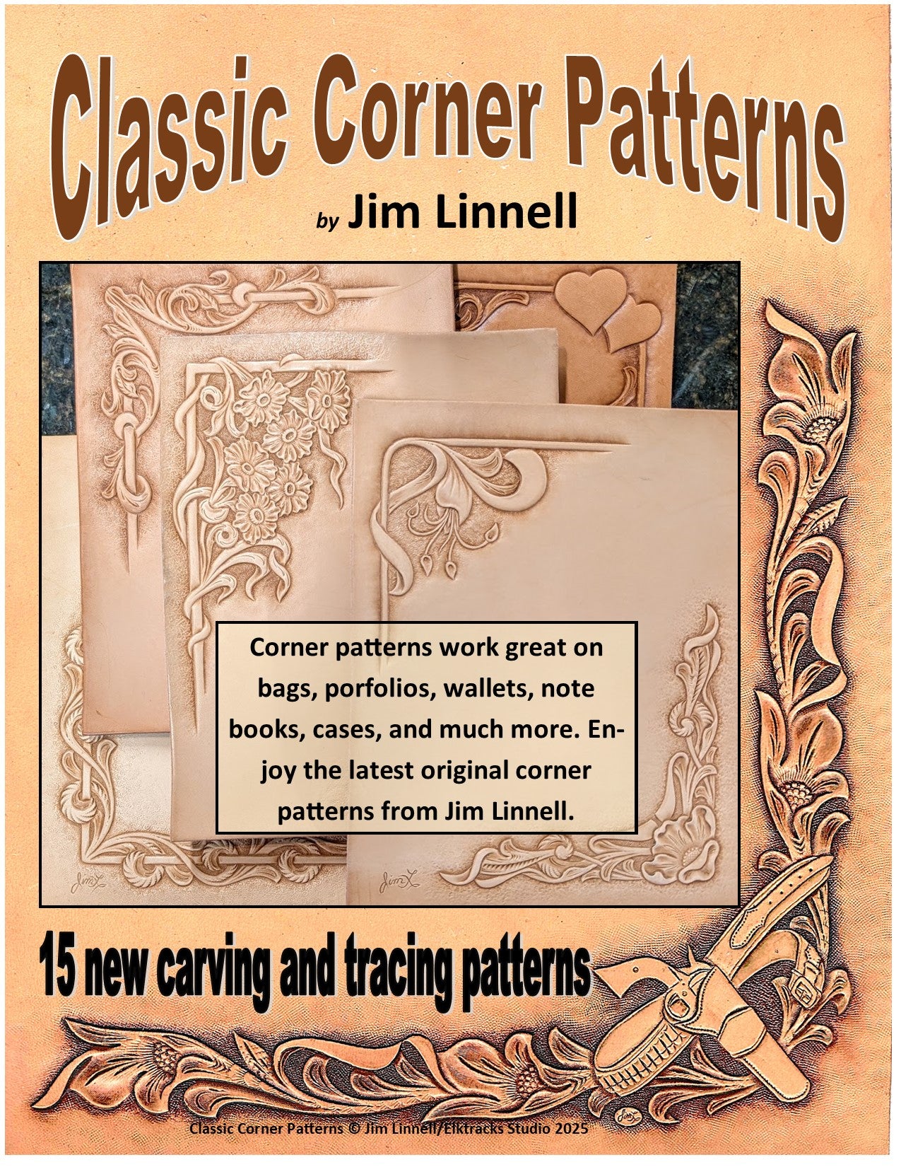 This is the newest corner carving patterns by Jim Linnell. They are classic, but most have never been seen before. Color photos accompany the tracing patterns for 15 interesting and challenging designs. Having some new and different corner patterns will let you add a new look to the next notebook, bag, Bible cover or portfolio project on your list. They are just so useful!! If you love classic western floral carving these should be in your library.