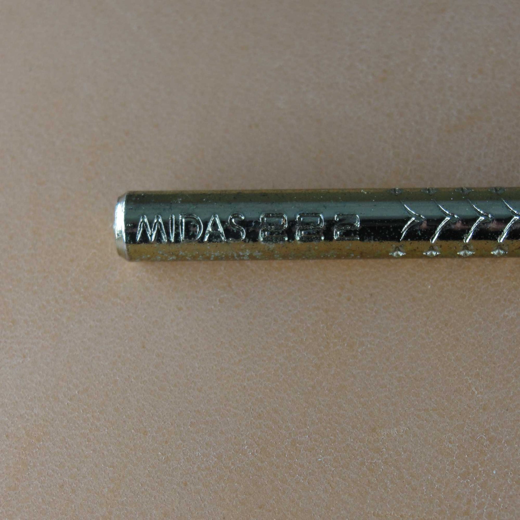 This used Chevon Geometric Border stamp was made by Midas (Kelly Tool Co) and is tool number 222. This tool impression measures 3/8" in width and 3/8" in height. Stamped on the tool is "Midas 222" and "Kelly Tool Co New Zealand". These old tools do not come available very often, so don't miss your chance to add a great tool to your collection. It still has many miles left in it.