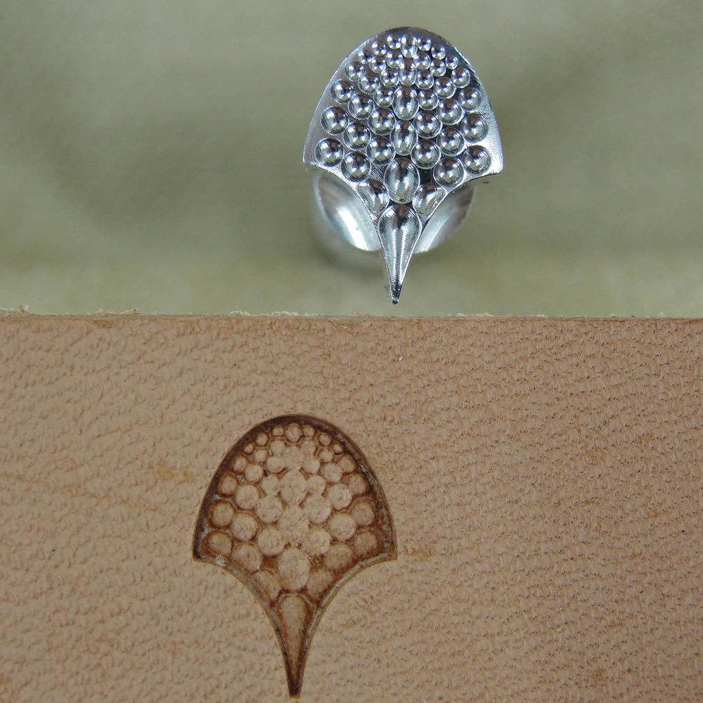 This tool is a stainless steel Dragon Scale Geometric stamp. The tool measures 9/16" in height and 3/8" in width. Marked on this tool is "Zhong Jiang" and "E803". This is a great stamp that produces a nice impression.