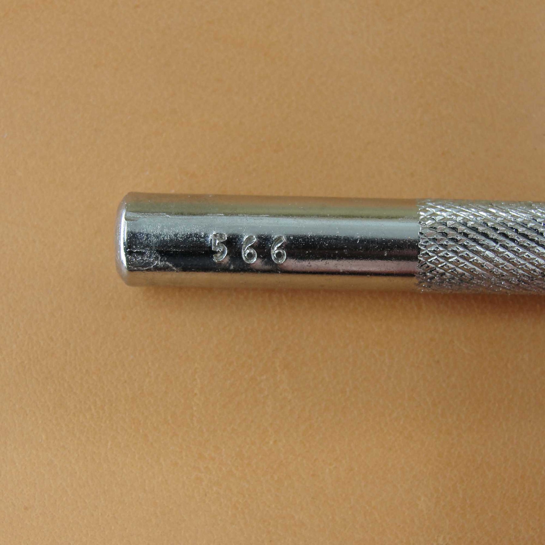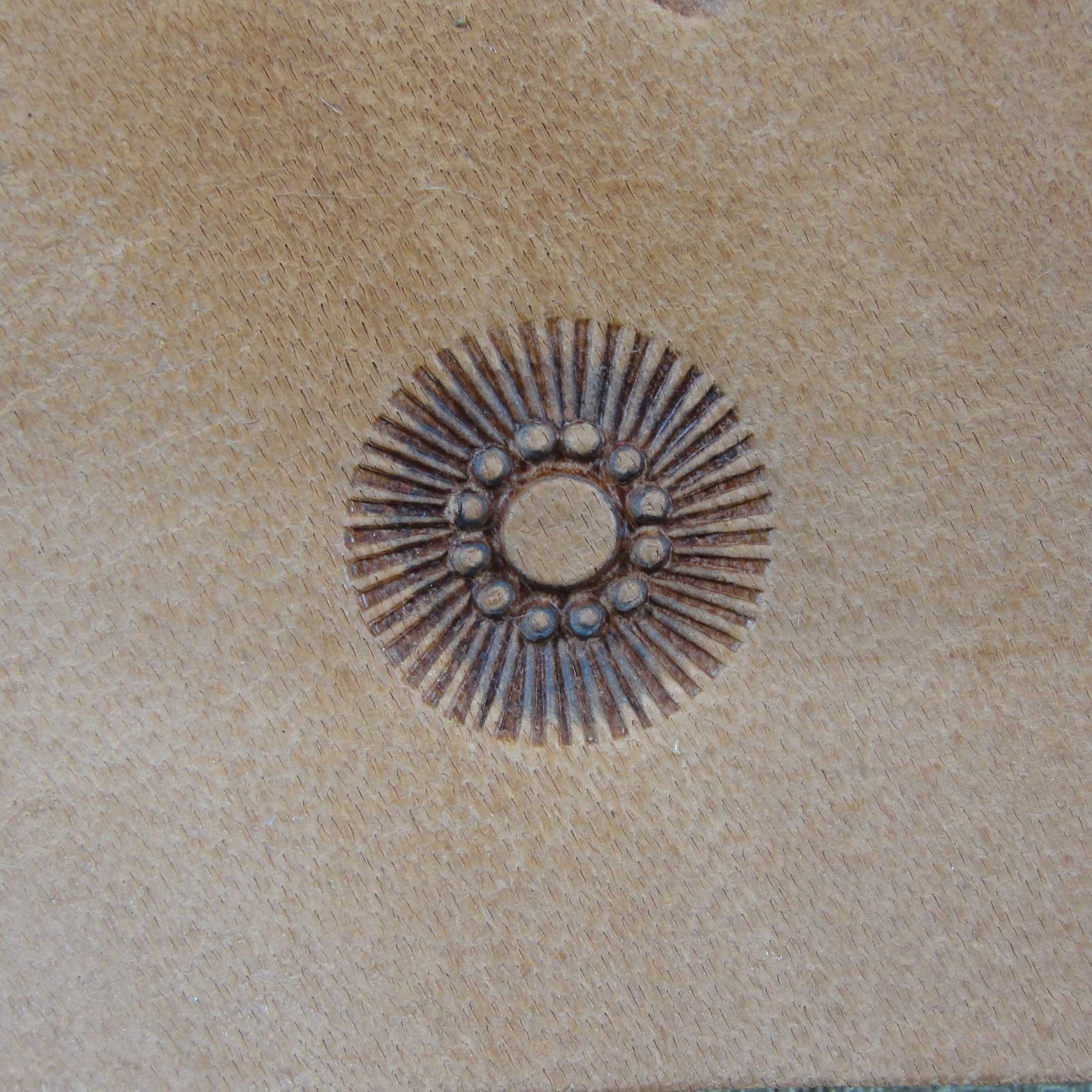 This used 12-Seed Flower Center stamp was made by Craftool Company prior to 1963. The tool is number 566. This Flower Center stamp is a great example of why many serious leather stampers prefer these vintage tools. The crispness and precision of this hand ground tool is beautiful and it is a tool you would be proud to own. This tool measures 1/2" in width. There is some chrome chipped off and rust on this stamp, including on the tool face. These old tools do not come available very often, so don't miss your chance to add a great tool to your collection. It still has many miles left in it.