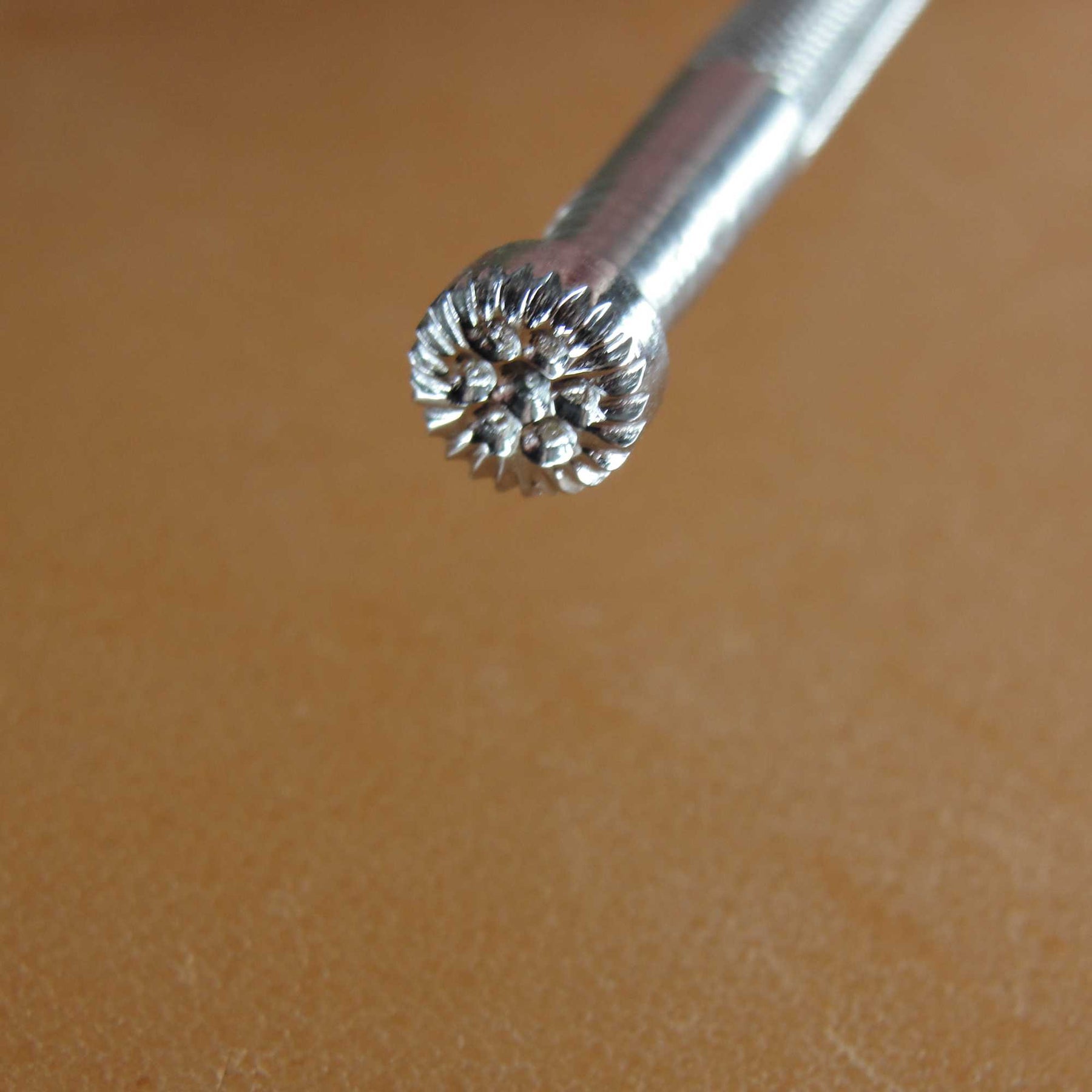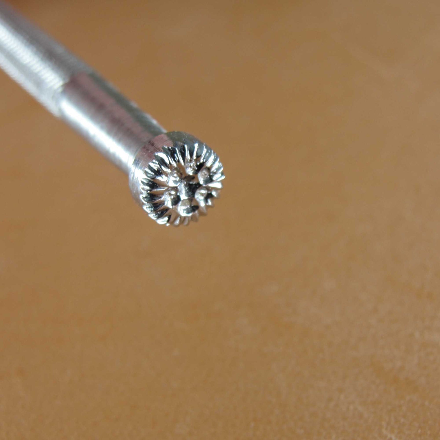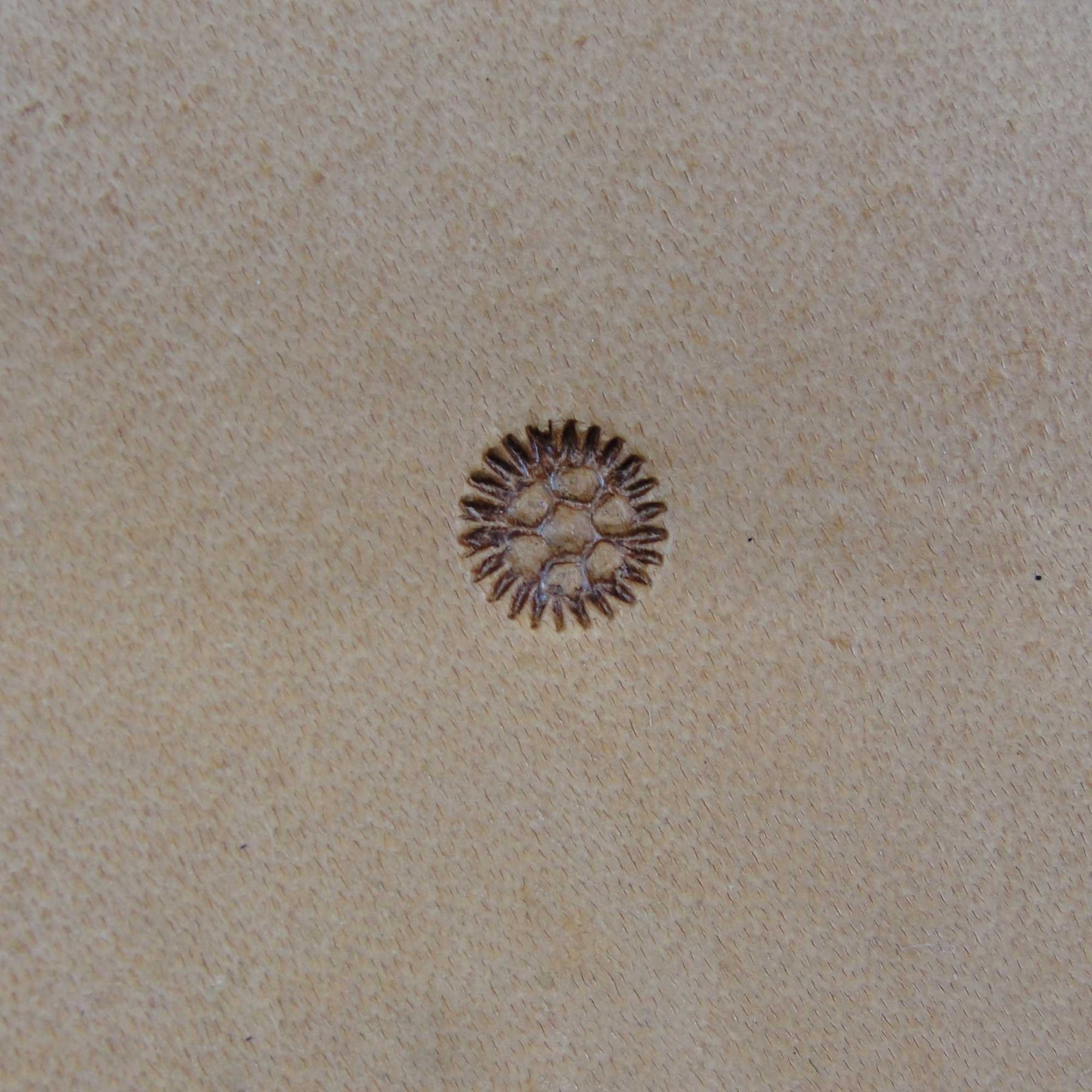 This used Small Flower stamp is tool number 817 and was made by RBS (Roth, Barnes, Stohlman). The tool measures 1/4" in width. This Flower Stamp is a great example of why many serious leather stampers prefer these vintage tools. The crispness and precision of these tools is beautiful and they are tools you would be proud to own because they perform the way they were intended. These old tools do not come available very often, so don't miss your chance to add a great stamp to your collection. It is ready to perform and still has many miles left in it.