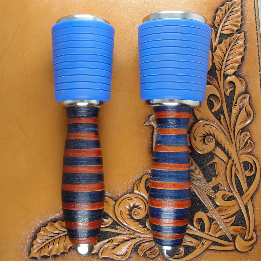 This Leather Tooling Maul uses a tapered, hardened nylon head with stainless steel hardware and fittings. The vegetable tanned leather handle features a two-toned stain. Each maul is unique and their rough dimensions are: