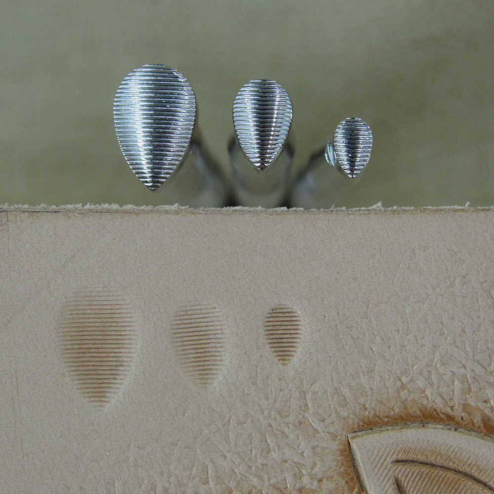 This is a set of 3 stainless steel Small Horizontal Lined Pear Shader stamps. The tools measure 3/16", 1/4" and 3/8" in length. Great sizes for small to medium floral patterns used on belts, wallets, etc. Marked on each tool is "Zhong Jiang" and its number, "P025-1", "P025-2" and "P025-3". This is a great stamp set that produces nice impressions.