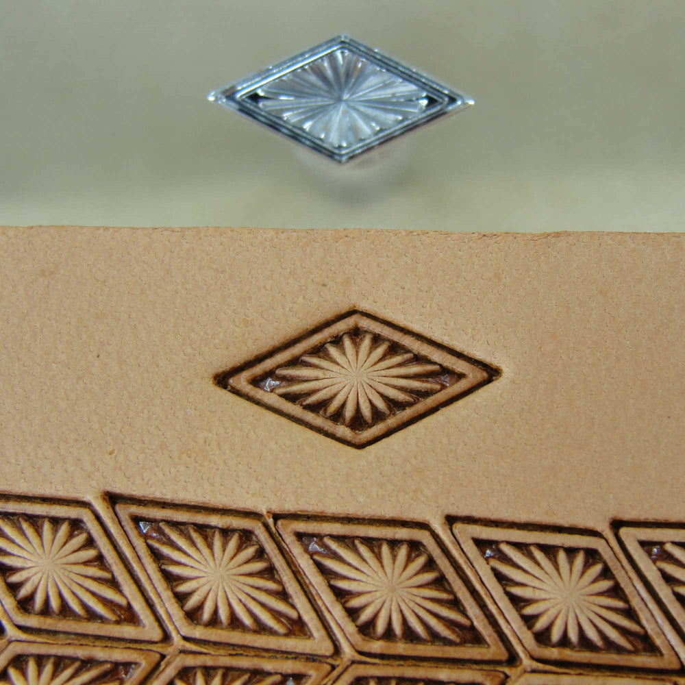 This tool is a stainless steel Small Lined Diamond Geometric stamp. The tool measures 1/2" in length and 1/4" in width. Marked on this tool is "Zhong Jiang" and "E126". This is a great stamp that produces a nice impression.